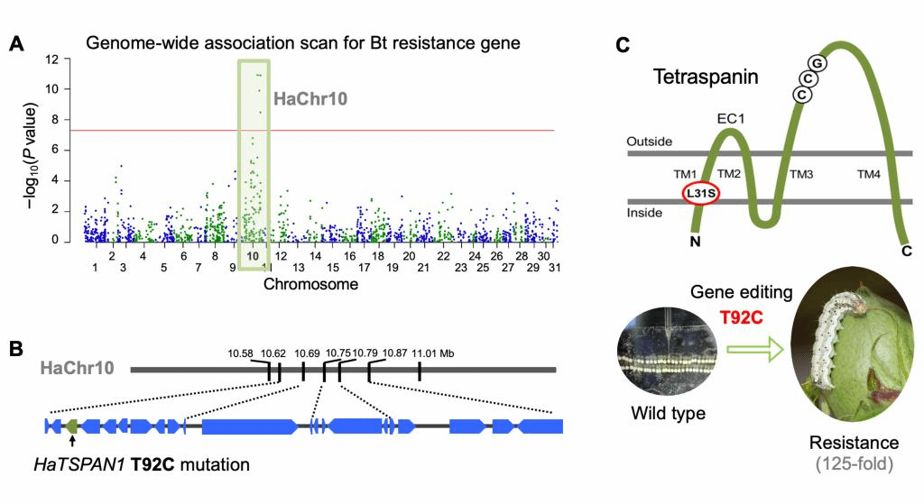 利用全基因组关联分析和基因精细定位,将棉铃虫Bt显性抗性基因定位于棉铃虫第10号染色体上250 kb长的特定区域,对该区域21个功能基因进行碱基序列和表达水平的比对,发现一种四跨膜蛋白编码基因HaTSPAN1发生了T92C点突变,导致第31位亮氨酸突变为丝氨酸,该基因突变与Bt显性抗性紧密连锁。利用CRISPR/Cas9基因编辑技术敲除抗性品系HaTSPAN1基因导致其Cry1Ac抗性完全消失,将T92C点突变敲入敏感品系则获得125倍抗性。上述正向和反向遗传学证据明确了棉铃虫HaTSPAN1基因T92C点突变与Bt显性抗性之间的因果关系。